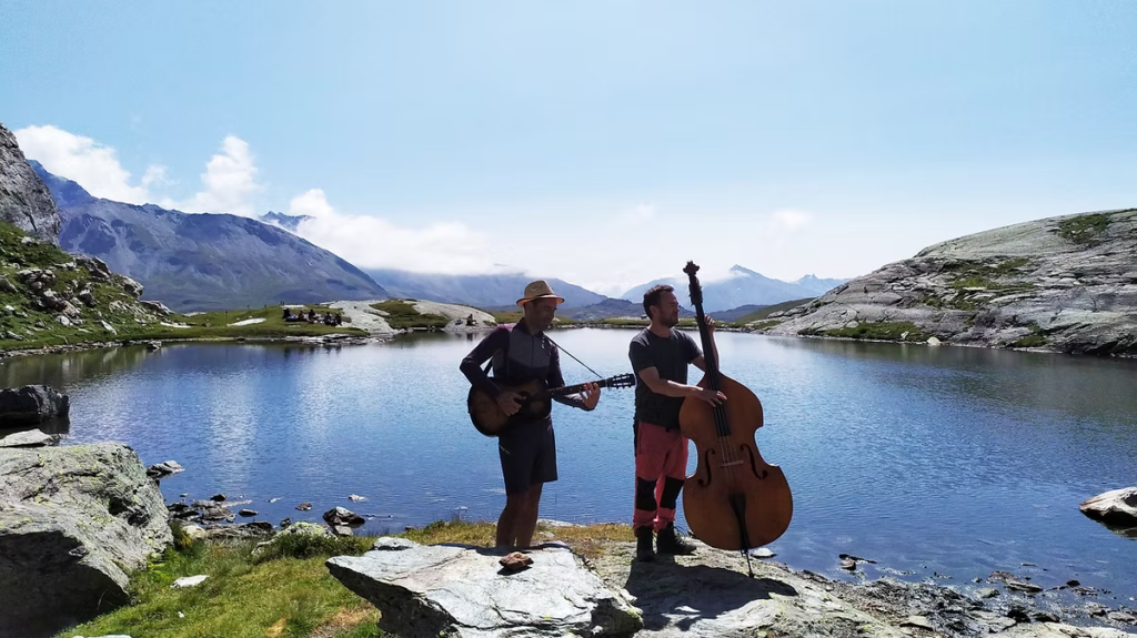 Et je pense que les randonneurs qui nous voyaient arriver avec nos instruments hallucinaient aussi. Qui sont ces fous qui, en pleine montagne à 2500 mètres d’altitude, au pied d’un glacier, sortent une contrebasse et une guitare et commencent à jouer face au lac ?!